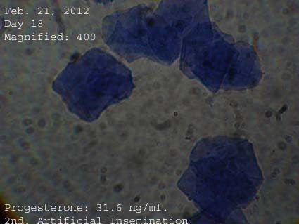 Progesterone มีค่า 1.43 ng/ml. ในวันที่ 15 กุมภาพันธ์ 2555 นับเป็นวันที่ 12 ในการเป็นสัด เราได้ทำการเจาะเลือดหาระดับฮอร์โมน Progesterone มีค่า 2.00 ng/ml. คาดว่าอีกประมาณ 3 วัน คือในวันที่ 18 กุมภาพันธ์ 2555 ไข่คงเริ่มตก (ระดับฮอร์โมน Progesterone คงมีค่าประมาณ 4 - 10 ng/ml.) เราได้ทำการผสมเทียมเมื่อวันที่
